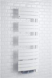 Radiateur sèche-serviettes étroit ventilo avec commande déportée programmable et patère incluse.
